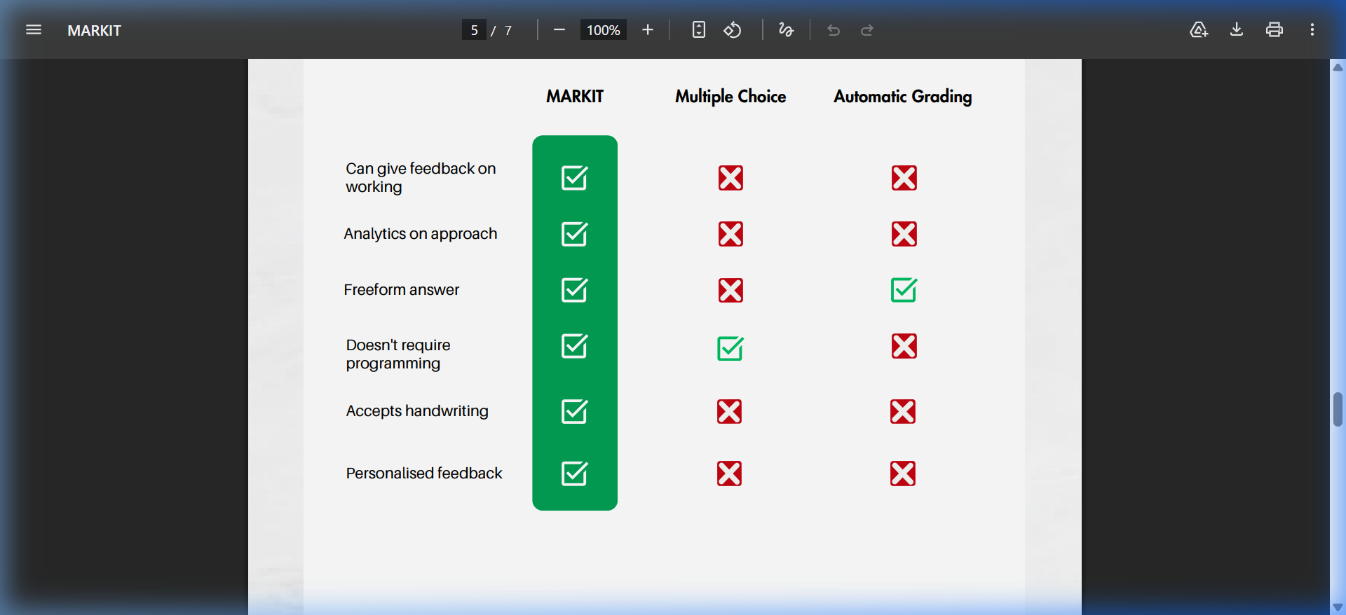 The MarkIt AI engine follows a sophisticated feedback loop. The process begins with scanning student submissions into digital formats. The AI OCR engine then analyzes the handwriting and freeform text to identify the student's problem-solving approach. Using a built-in learning model, the system compares the submission against teacher-defined logic. If a similar pattern has been seen before, it provides automatic feedback; otherwise, it learns from the teacher's manual correction to automate future instances. This continuous learning cycle ensures that the system becomes more efficient and accurate with every submission processed.