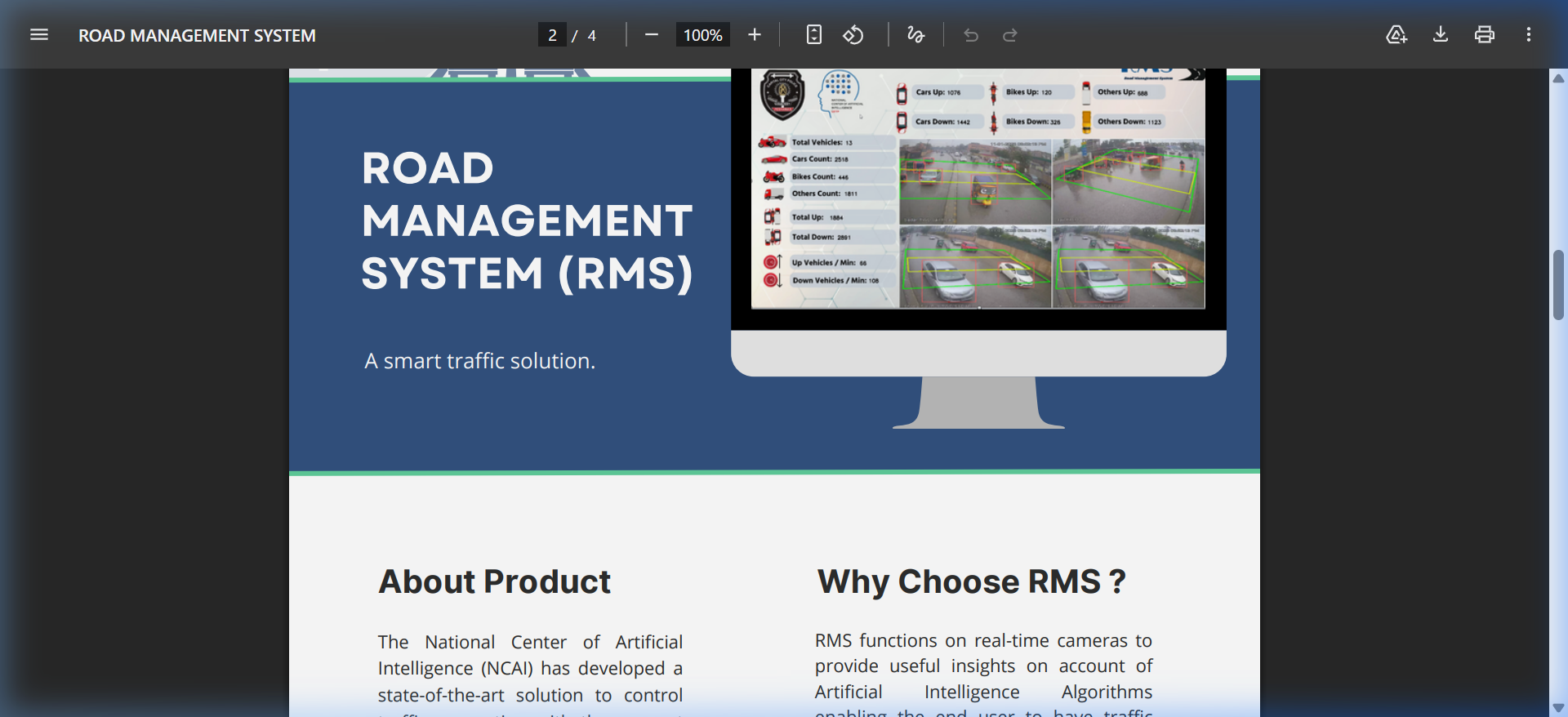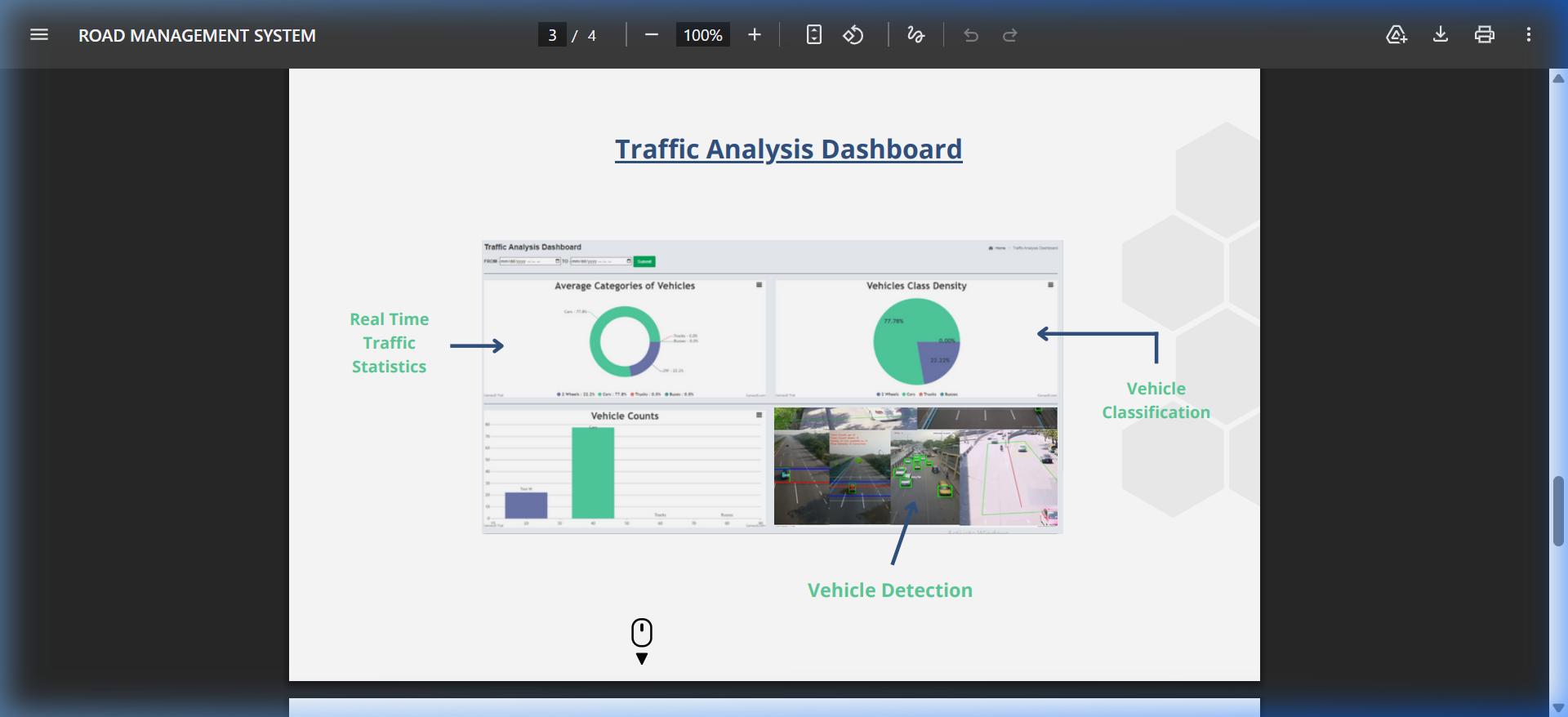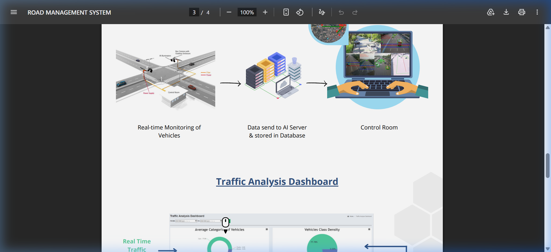 The architecture of the Road Management System (RMS) is built on a network of traffic cameras strategically placed along roads, all linked to RMS servers. These cameras continuously monitor traffic flow, transmitting data to the servers. Leveraging advanced Artificial Intelligence (AI) and Machine Learning (ML) models, the servers analyze this data, accurately determining vehicle directions, counts, traffic patterns, and other relevant metrics outlined in the system's features. Subsequently, this processed information is seamlessly displayed on the application's intuitive dashboards, providing users with real-time insights into road conditions and enabling informed decision-making for traffic management and navigation.